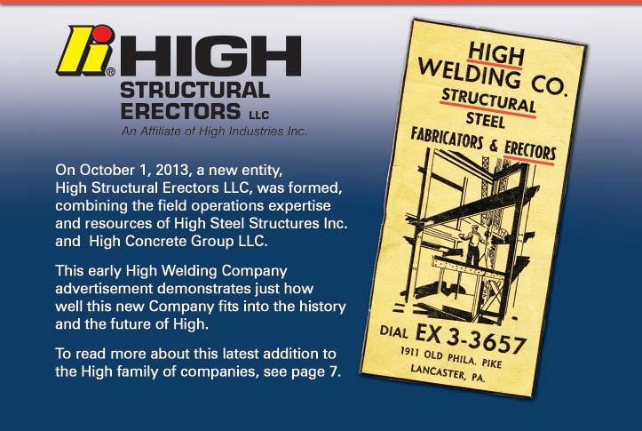 On October 1, 2013, High Structural Erectors LLC (HSEL) became a new High® entity, and is a High Industries Inc. affiliate. The Company combines the field operations capabilities and expertise of High Steel Structures Inc. and High Concrete Group LLC, and is under the supervision of Paul Lipinsky, Vice President.