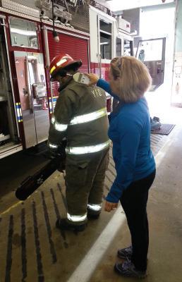 HEHSCL’s Lisa Bolin uses a meter to measure noise exposure for this firefighter.