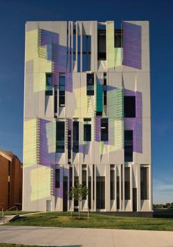 A “chiller plant” is a centralized system that cools the air, providing air conditioning for a building or collection of buildings. While a building of this type sounds as though it is very utilitarian, the South Campus Chiller Plant at Ohio State University appears to be anything but ordinary! Constructed of precast panels with a high sheen finish and featuring large glazed openings, fins of dichromic glass in the joints of the concrete panels cast colored light rays across the concrete surface. The result is a dynamic façade that changes with the time of day, season, and location of the observer.