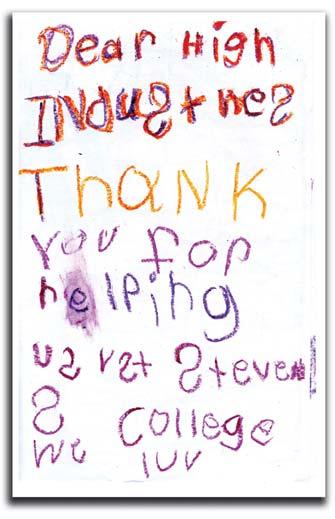 The Adopt-A-Kindergarten program includes in-class, hands-on presentations by Thaddeus Stevens faculty that informs children about specific fields of study. Presentations in the fields of plumbing, CAD, metals fabrication and welding, water and environmental technology (just to name a few), are presented in a fun and engaging way. Once faculty members have visited the classroom, children participate in a campus tour where each child is given a hard hat, Kindergarten students from Washington Elementary School drew pictures and created cards to thank High for its support of Adopt-A-Kindergarten.