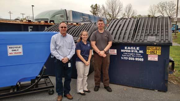 Randy Horning, Eagle Disposal’s Katy Eby, and Tim Barna pose in front of the recycling bins at HSSC.