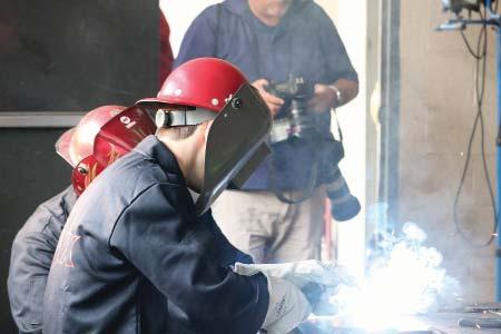At High Steel Structures LLC, educators watched in awe as the Gemini machine, which processes shape cuts and holes in steel plates, cut the High logo out of steel. Moments later, they were invited to try their hand at welding the High logo to its base – an exercise all agreed was “much harder than it looks.”