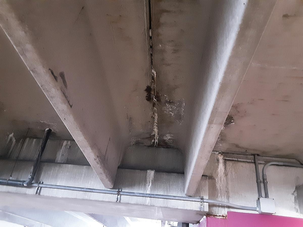 Below, concrete deterioration (left) and failed waterproofing (right) were just a few of the repairs identified for this parking structure.