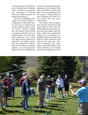 of the most physically demanding projects in the history of the camp, cheerfully and with great gusto. It was so gratifying to see the campers running along the ditch, following the water as it was released into the newlycleaned ditch. The campers come to camp to fish, and they represent all skill levels when they arrive. We kick off the skills instruction with casting, and novice anglers learn the basics while more experienced anglers work on advanced casting skills. Campers learn fly tying skills by formal instruction and informal free tying time. They learn entomology, and survey aquatic macroinvertebrates and water chemistry at every fishing location. Through these exercises