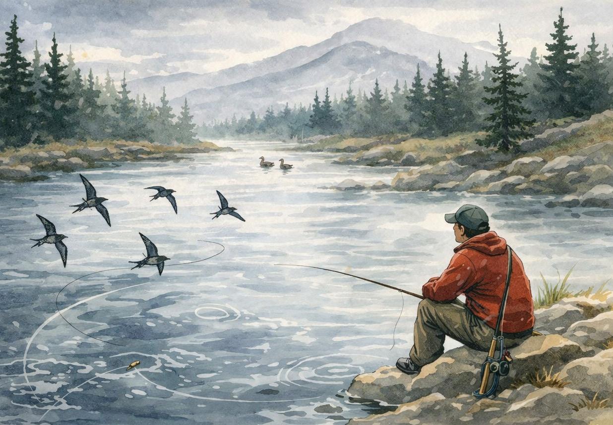 Just then a swallow appeared, working a beat to windward, low over the river, swooping occasionally to skim something off the water. Whether feeding or drinking I couldn’t tell. It continued on upstream to the base of the turbulent water then wheeled back downstream to opposite of where I sat, then turned again and worked back up-river. My prospects of catching a fish lifted. Swallows need to consume their body weight of prey per day to survive, hence are harbingers of a hatch to a hopeful angler. They don’t expend energy for fun.