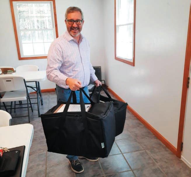 Pastor Brent Nidiffer heading out of the Pine Grove Methodist Church Fellowship Hall with duffel bags filled with soup meals to deliver.