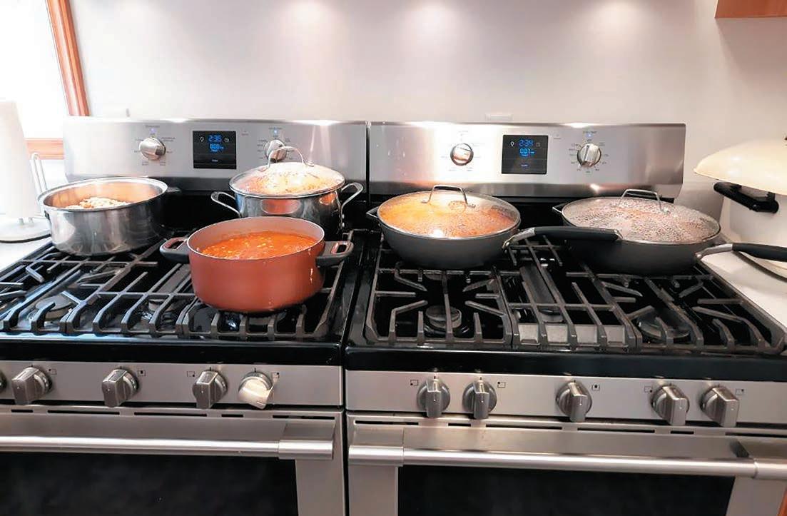 Pots of soups and various other foods prepared in the Toe Valley Soup Ministry kitchen.