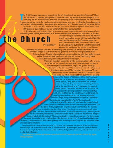 he first thing your eyes saw as you entered the art department was a poster, which read “Who is this fellow, Art?” It seemed appropriate for me as I entered my freshman year of college in 1978 searching for “art”. But who/what exactly is art? Simply put, it is communication. An artist is merely someone using a particular medium to get their message across. As a college freshman I stereotypically named painting, drawing, photography or sculpture as “art.” However, the truth is that we find art all around us. God’s creation communicates His love for us by providing color-rich sunsets, a stylishly designed automobile, or even a well-crafted sermon by your pastor! As Christians, we enjoy a long history of art. Art that was created for the expressed purpose of communicating God’s message of salvation to us.The Lord created the rainbow as a promise to us that He would never again flood the earth as He did in Noah’s time (a masterpiece we can still view today). With His own hand He wrote the Ten Commandments on stone tablets for Moses to deliver to His chosen peoBy Steve Blakey ple. David, inspired by the Lord, wrote the Psalms and planned the building of the temple (which his son Solomon would later construct as foretold by God). Some of the earliest depictions of Christ would be foreign to us today, as He was generally shown as a young, beardless man. Reformation-era Christians foreshadowed modern publishing with their ability to massproduce illustrated theological tracts using woodcuts and the printing press (www.ibiblio.org/wm/paint/auth/durer/engravings/). There’s an important element in artistic communication I refer to as the “ah ha” factor. You most often see it when an advertiser is hoping to make their product memorable, so you will go out and buy it. Remember the Gatorade TV commercials where the athletes are dripping colored sweat? The voiceover does not say,“These people have been drinking Gatorade and its different colors will come out when you sweat them out.” All you see and hear at the closing is “Gatorade... Is It In You?” and you mentally say to yourself,“Ah-ha, I get it.”When the consumer “gets it,” they tend to remember the product because they felt they were in on something. The same is true for good liturgical or Christian art. If executed well, it should contain an element of the “ah-ha” factor. You’ve seen those bumper stickers where the ichthys with little feet formed the word Darwin, and they are followed by another bumper sticker showing a (smaller) Darwin ichthys being swallowed by a larger TRUTH ichthys? That is a great example of the “ah-ha” factor at work. Lutheran liturgy is filled with rich examples of multiple (mixed) media pulled together to communicate God’s message of salvation.Take the order of Holy Baptism on page 199 in Lutheran Worship.The main elements (media) involved are God-given (Word and the water). It generally takes place within a church (architecture), with a font (sculpture), vestments, a white garment for the baptized (textiles) and a baptismal candle, which usually has a symbol on it depicting the Holy Spirit (illustration).This is no masterpiece housed in a museum. It’s a living, ongoing work. Amazingly, we are privileged to collectively recite the Lord’s Prayer (another God-given element), while witnessing Christ (through the pastor and congregation) expand His church on earth (interactive presentation). As mentioned, an artist is someone who is trying to communicate something to his/her audience, and usually is the one who chooses how to solve this issue. Depending on how well the artist knows their subject, coupled with their creative ability and knowledge of the audience, will determine how successful their efforts are. Steve Blakey is a member of Redeemer Lutheran Church, Fort Wayne, IN and is Art Director for Higher Things magazine.