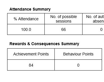 • Classroom success – Attendance 96% or above in 4 terms. Positive rewards score. ATL 2.8 or better.