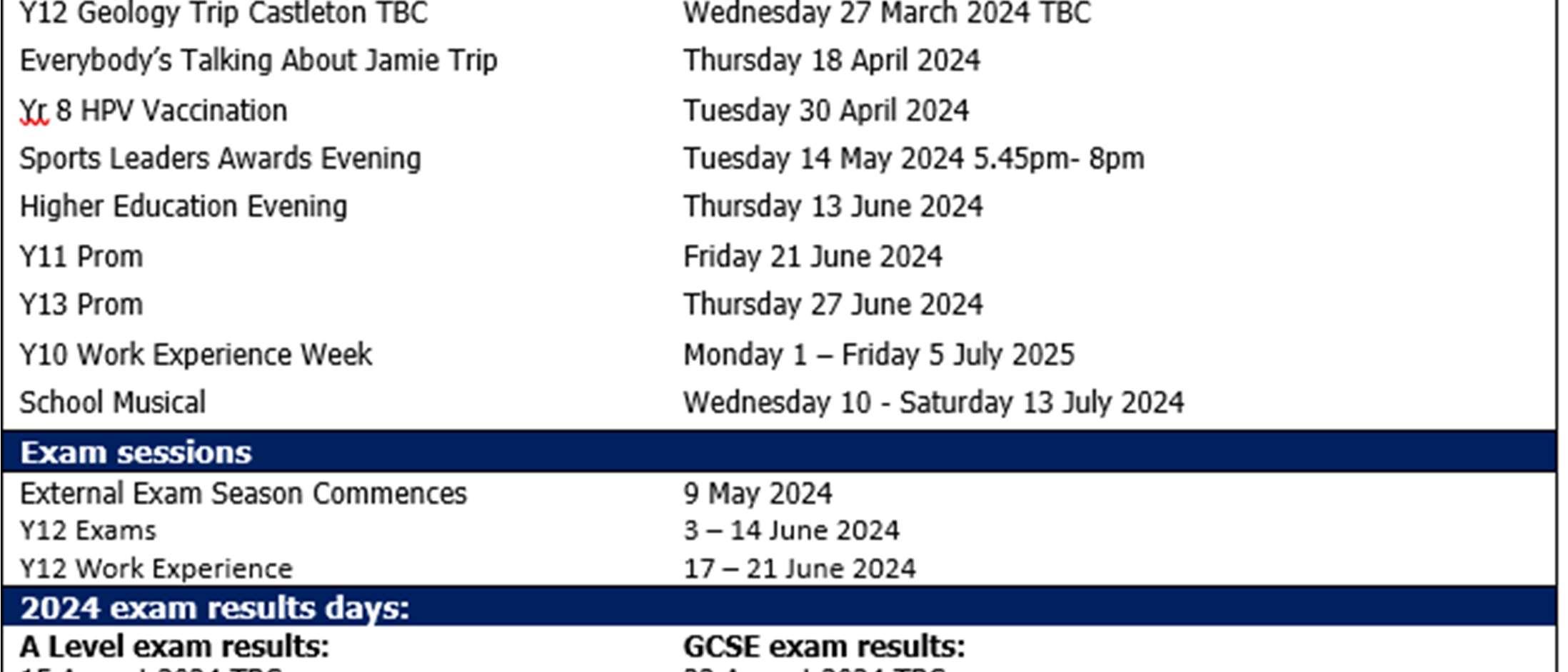 Timetables for the summer external exams starting in May are now available on the school website on the Exams page. Final versions of the timetables, with afternoon start times added, will be published nearer to the start of the exams, and paper copies will be issued to students at this time. Please note when planning holidays after the end of exams for Year 11 and Year 13 students, that they must be available to sit exams up to and including the exam boards' contingency date of Wednesday 26 June
