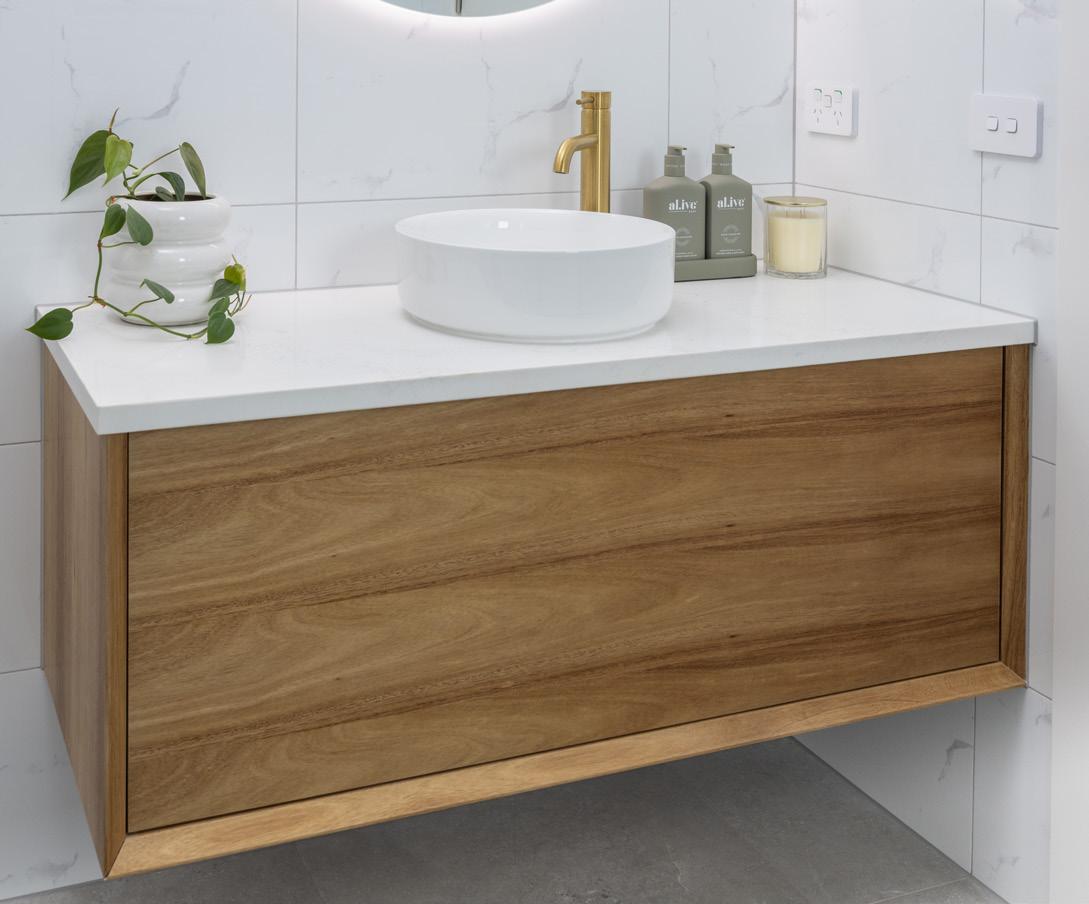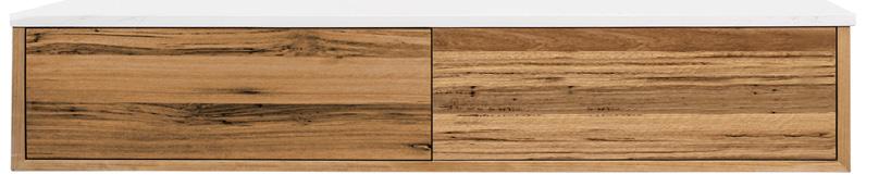 A perfect blend of modern technology and beautiful natural resources, the BYRON Blackbutt Timber Wall Hung Vanity NO TOP, adds a timeless and elegant touch to any bathroom. Just like your fingerprints, no two are the same; the natural elements of Blackbutt hardwood timber are unique on every piece. This vanity will add warmth and texture to your space, whilst visually softening its appearance against hard materials such as mirrors and tiles to create a luxurious aesthetic. The BYRON Blackbutt Timber Wall Hung Vanity NO TOP can be personalised with your choice of natural stone, marble, solid surface, or quartz top to create your own unique bespoke piece. The eco-friendly design of Highgrove Bathrooms new vanities uses water-resistant properties with an interior core of 23mm of marine ply, for minimal maintenance and to ensure they don’t expand and contract overtime. The interior core is wrapped around and aligned throughout the entire cabinet, it gives a seamless and beautiful continuity across the whole piece. Featuring Blum soft-close drawers, the BYRON Vanity range is available in 5 sizes (750, 900, 1200, 1500 and 1800mm.) The BYRON Vanity range in 1200-1800mm features two middle dividers giving you flexibility of installing a basin in the centre of the Vanity or up to 3 basins on the 1800mm size. Top Sold Separately.