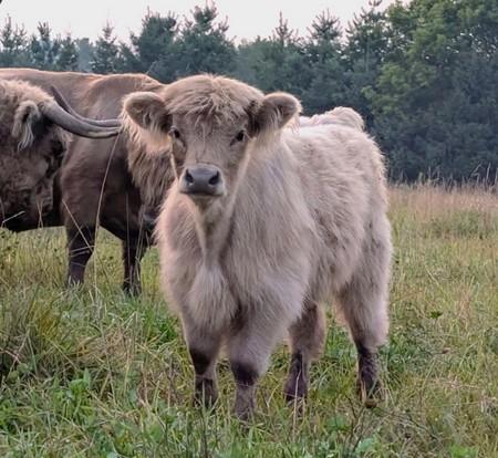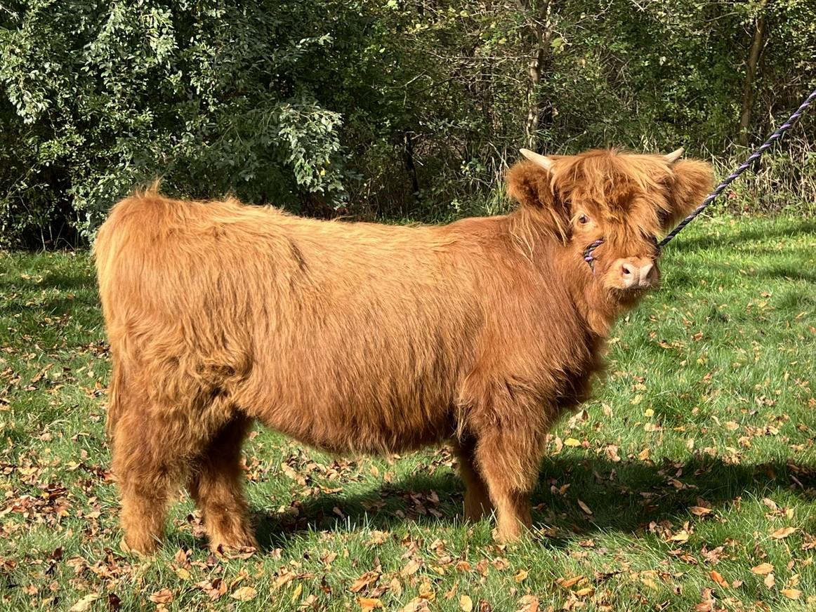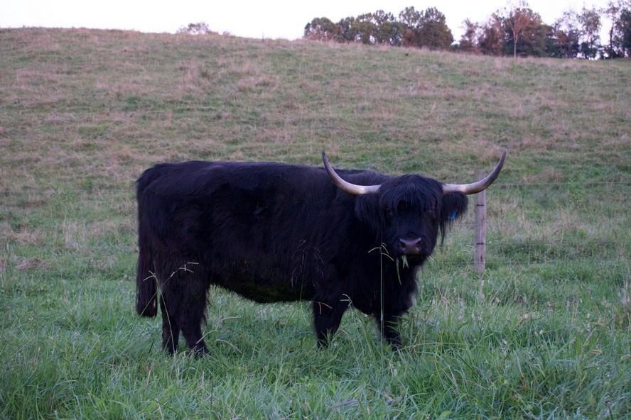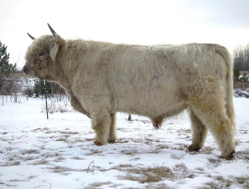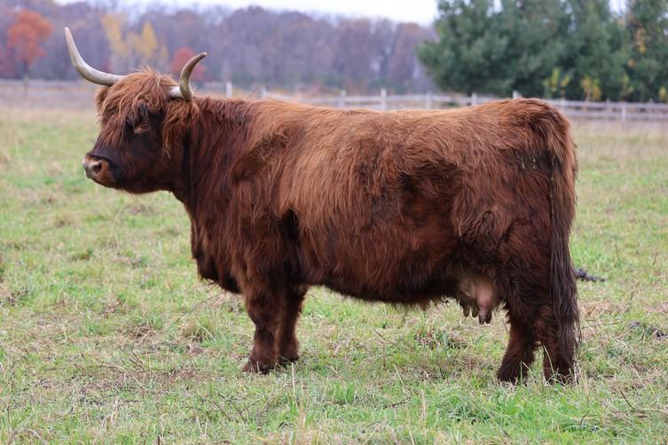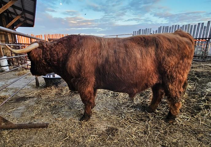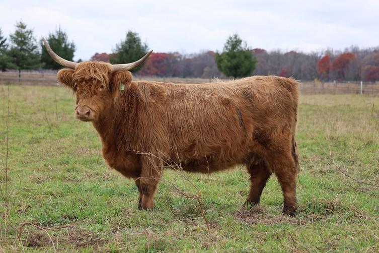 We bought CBS Hagrid & his dam off the 2020 North Central Highland Cattle Production sale as a cow/calf pair from Cobble Stone Farms. They arrived that summer and at weaning (End of Oct.) Hagrid was 580lbs. He has had a halter on a few times in his life as a young bull but is not selling as halter broke. He handles easily between pastures or loading on & off the trailer. His calm temperament & mellow demeanor make him very easy to be around. He Likes to be combed & petted, and will also take horse treats out of your hand, I have hands on him daily. He respects hot wire fences and has been the only mature bull out in pasture when he is working on breeding cows. Hagrid has been studded out the past 3 years to farms with non-registered highlands and has always been very productive and gotten the job done.