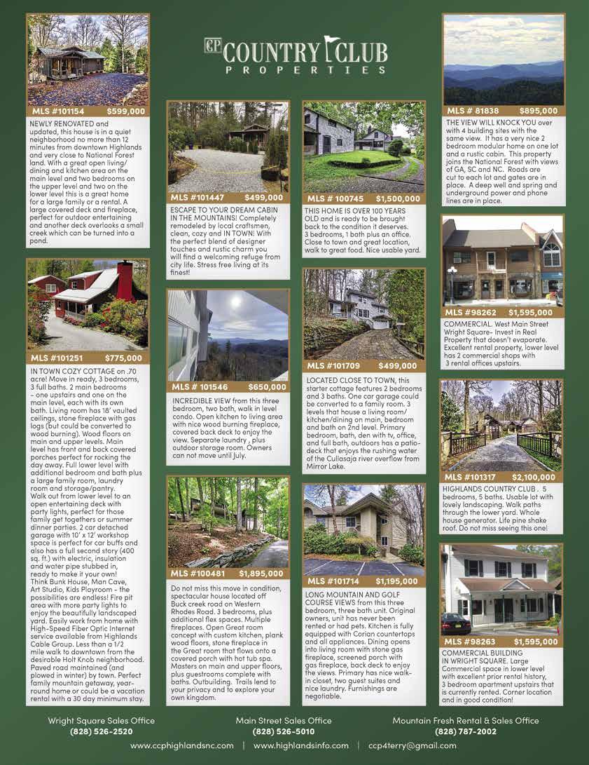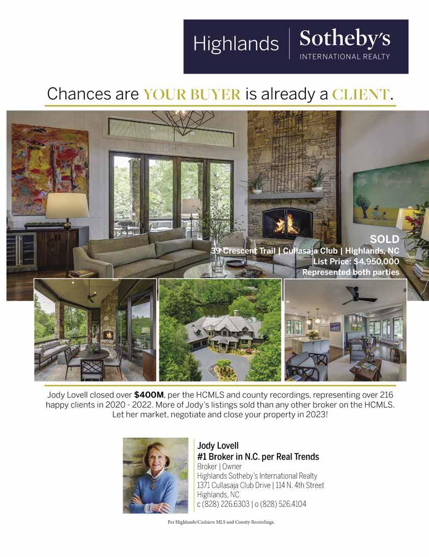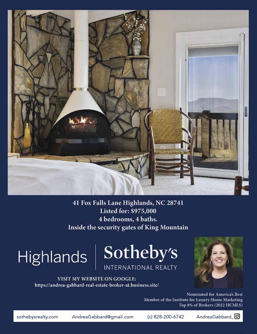 224 MAY 2023 | THELAURELMAGAZINE.COM 224 ADVERTISER’S INDEX The Consignment Market P 41 Country Club Properties ccphighlandsnc.com P 2 Crawford Construction P 12 Creative Concepts P 200 Cynthia Strain, Photographer/Author P 190 The Dancing Bear at the High Dive P 127 Dauntless Printing P 58, 201 Dawson County destinationdawsonville.com P 118 Diane McPhail, Artist P 112 Don Leon’s P 29 The Dry Sink thedrysink.com P 34 Dutchmans dutchmansdesigns.com P 206 Edgewood Antiques & Fine Furnishings P 32 Elena’s Women’s Golf and Activewear elenagolf.com P 60 Elevation of Highlands P 90 The Exchange P 89 Finders Keepers P 41 Fire + Water firemt.com P 15 Fire Mountain Inn & Cabins firemt.com P 15 Four65 Woodfire Bistro + Bar four65.com P 130 Four Seasons Landscape fsl-wnc.com P 87 Fusion Yoga & Wellness fusionyogaandwellness.com P 148 Gracewear gracewearcollection.com P 85 Grand Olde Station grandoldestation.com P 158 The Greystone Inn thegreystoneinn.com P 4, 164 Headwaters Outfitters headwatersoutfittters.com P 165 High Camp HighCampNC.com P 4 The High Dive P 127 Highland Hiker highlandhiker.com P 91 Highlands Aerial Park highlandsaerialpark.com P 70 Highlands Cashiers Chamber Music Festival h-cmusicfestival.org P 116 Highlands Cashiers Health Foundation hchealthfnd.org P 187 Highlands-Cashiers Hospital missionhealth.org/Highlands P195 Highlands-Cashiers Players highlandsperformingart.com/hcp P 108 Highlands Chamber of Commerce highlandschamber.org P 94 Highlands Dermatology highlandsdermatology.com P 185 Highlands Fine Art & Estate Jewelry Wine Shop highlandsfineart.com P 23 Highlands Lawn & Garden highlandslawnandgarden.com P 190 Highlands Outpost highlandsoutpost.com P 70 Highlands Performing Arts Center highlandsperformingarts.com P 38, 109, 193 Highlands Pharmacy P 191 Highlands Pizza Place P 135 Highlands Rock Yard highlandsrockyard.com P 59 Highlands Smokehouse highlandssmokehouse.com P 136 Highlands Sotheby’s International Realty - Andrea Gabbard sothebysrealty.com P 48 Highlands Sotheby’s International Realty - Sheryl Wilson highlandssir.com P 201 Highlands Transportation Company P 78 Historic Toxaway Market historictoxawaymarket.com P 162 4118 Kitchen and Bar 4118kitchen-bar.com P 135 A Jones Company P 56 A-List Antiques P 57 Acorns P 228 ACP Home Interiors acphomeinteriors.com P 49 Aery Chiropractic aerychiropractic.com P 191 Allen Tate/ Pat Allen Realty Group patallenrealtygroup.com P 9 Allison Diane P 150 Ann Lea Fine Art Gallery P 99 Annawear annawearnc.com P 58 Appalachian Animal Rescue P 146 Appalachian Construction app-construction.com P 164 Around Back at Rocky’s Place aroundbackatrockysplace.com P 108, 112 Art Highlands Gallery arthighlands.com P 117 Atelier Maison ateliermaisonco.com P 142 Balistreri Realty laketoxawayliving.com P 165 The Bascom thebascom.org P 101 Barbara Jamison Paintings barbarajamisonpaintings.com P 115 Bazaar Barn P 80 Bear Tracks Travel Center beartrackstravelcenter.com P 161 Bella Cotn bellacotn.com P 168 Bella’s Junction Cafe P 135 Berkshire Hathaway HomeServices meadowsmountainrealty.com P 141 Beth Bowser P 110 Betsy Paul Art Benefit P 102 Betsy Paul Properties betsypaulproperties.com P 227 Bijou Jewelry bijoujeweler.com P 151 Bird Barn & Garden P 52 Black Rock Design Build blackrockdb.com P 178, 200 The Blue Elephant P 54 Blue Ridge Bedding blueridgebedding.com P 140 Blue Ridge Music blueridgemusicacademy.com P 116 Bombshell Hair Boutique P 182 Bounds Cave’s Rug Gallery boundscaverugs.com P 29 Brookings brookingsonline.com P 83 Bungalow Boutique bungalow828.com P 149 C Orrico corrico.com P 61 Calders Coffee Cafe calderscoffeecafe.com P 133 Caliber Fine Properties caliberfineproperties.com P 92, 93 Carolina Elegance P 179 Carolina Rustic Furniture carolinarusticfurniture.com P 140 Cashiers Chamber of Commerce cashiersareachamber.com P 90 Cashiers Candy Shoppe P 91 Cashiers Kitchen Company P 52 The Cashiers Store thecashierstore.com P 61 Cashiers Valley Community Chorus P 172 Cashiers Valley Real Estate cashiersvalley.com P 171 Chambers Realty & Vacation Rentals highlandsiscalling.com P 60, 200 Charles Johnson Fine Art Photography charlesjohnsonfineart.com P 114 Chocolate Heaven/Cake Bar P 183 Christine’s Home Decor christineshomedecor.com P 201 Christmas Tree P 209 Classic Lighting & Design, Inc. classiclightinganddesign.com P 147