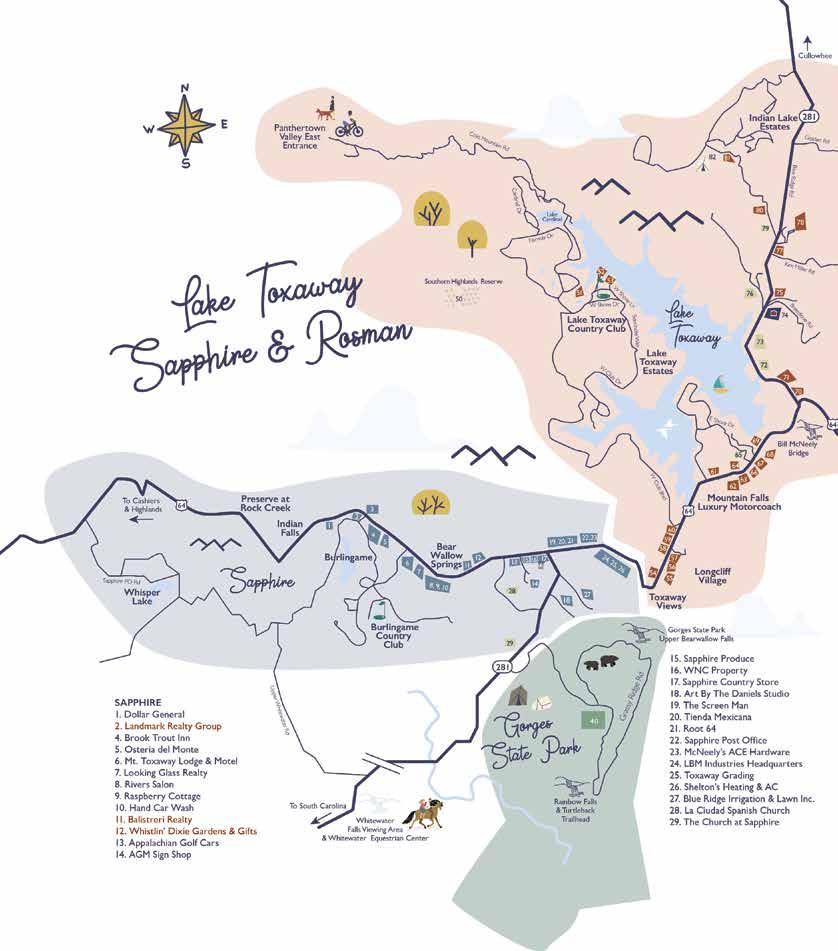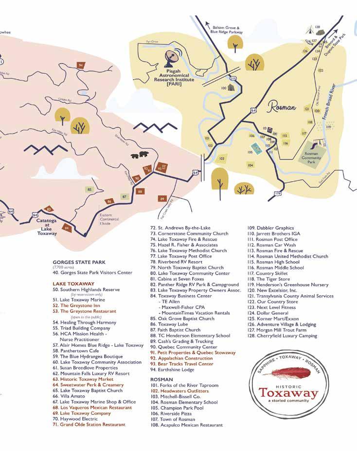 225 MAY 2023 | THELAURELMAGAZINE.COM ADVERTISER’S INDEX 225 MAY 2023 | THELAURELMAGAZINE.COM ADVERTISER’S INDEX HomeChoice Windows & Doors P 173 Hudson Library fontanalib.org P 184 Hummingbird Lounge oldedwardsinn.com P 228 J. Gabriel P 205 Jannie Bean janniebeandesigns.com P 39 Jeanie Edwards Fine Art jedwardsfineart.com P 100 Jennings Builders Supply jbwnc.com P 47 Josephine’s Emporium P 57, 201 John Cleaveland Realty jcrealty.com P 30 K-9 Meadows P 56 Kenneth Bowser Art P 117 Killer Bees killerbeeshoney.com P 162 King Background Screening kingbackgroundscreening.com P 200 The Kitchen thekitchenofhighlands.com P 133 Lake Toxaway Company laketoxaway.com P 159 Lakeside Restaurant lakesiderestaurant.info P 125 Landmark Realty Group landmarkrg.com P 10 Landmark Realty Group - Pam Nellis landmarkrg.com P 10, 201 Las Margaritas P 124 Laura Moser Art lauramoserart.com P 5 Lehotsky & Sons lehotskyandsons.com P 46, 200 Lenz Gifts & Luxury Linens P 53 Leslie Jeffery lesliejeffery.art P 114 The Look Boutique P 21 Los Vaqueros P 137, 161 Lupoli Construction lupoliconstruction.com P 208 Luxury Pet Grooming P 147 Main Street Gifts P 149 Main Street Nursery P 81 Melinda Barber Design Group melindabarber.com P 201 Martha Anne’s P 204 McCulley’s P 3 McKee Properties mckeeproperties.com P 76, 77, 207, 216-223 Meraki Escapes merakiescape.com P 164 Michele Page Webster, Artist pagetheartist.com P 110 Mirror Lake Antiques mirrorlakeantiques.com P 28 Morales Painting P 184 Mountain Construction Engineering mountain-ce.com P 148 Mountain Mermaid P 204 Mountain Spring Spas and Pools mountainhotspring.com P 17 Mountain Theatre Company mountaintheatre.com P 105 Mountaintop Art and Craft Show highlandsartshow.com P 111 Mountainworks Custom Home Design, Ltd. mtnworks.com P 75 Nancy’s Fancys P 89 Nearly New nearlynewnc.com P 40 Nora & Co. P 19 Oak Steakhouse oaksteakhousehighlands.com P 120 Old Edwards Inn & Spa oldedwardsinn.com P 200, 228 On the Verandah ontheverandah.com P 131 The Orchard theorchardcashiers.com P 135 Paoletti’s paolettis.com P 125 Pat Calderone calderonegallery.com P 113 Peak Experience peakexp.com P 59 Peggy Marra peggymarra.com P 111 Petit Properties Real Estate petipropertieswnc.com P 165 Pilates of Cashiers pilatesofcashiers.com P 185 Platt Architecture platt.us P 36 37 Porch Living porchliving247365.com P 202 Preferred Properties of Highlands - Ann Scott ppoh.com P 201 Primary primaryhnc.com P 136 Rabun Flooring rabunflooring.com P 196 Reach of Macon County reachofmaconcounty.org P 54 Rebecka’s Home Cleaning Service P 200 Rent In Highlands-CCP rentinhighlands.com P 79 Robin’s Nest robinsnest-cashiers.com P 215 Roman’s Roofing romansroofingnc.com P 146, 201 Rusticks rusticks.com P 11, 152 Salt Organic P 33 Sapphire Valley Real Estate sapphirevalleyrealestate.com P 174 Sashay Around P 19 Shakespeare and Company shakespeareandcompanyhighlands.com P 89 Shear Elevations P 200 Silver Creek Real Estate Group ncliving.com P 66-69 Skyline Lodge skyline-lodge.com P 120 S’mores Kids Klothes smorekidsklothes.com P 78 Sotheby’s International Realty sothebysrealty.com P 62, 63 Southern Way P 55 The Spa Boutique at Old Edwards Inn oldedwardsinn.com P 228 Spoiled Rotten spoiledrotten2.com P 79 Stork’s Wrap, Pack & Ship P 15 Sugar Creek Custom Cabinets sugarcreekcustomcabinets.com P 35 The Summer House by Reeves summerhousehighlands.com P 119 Sweetwater Perk & Creamery historictoxawaymarket.com P 163 Tampa Bay Trust Company tampabaytrustcompany.com P 192 Tarah’s Beauty Bar P 200 Terry Warren Fine Art terrywarren.com P 113 TJ Bailey’s for Men tjbmens.com P 45 Town & Country General Store tandcgeneralstore.com P 28 The Ugly Dog Pub - Highlands theuglydogpub.com P 126 Vic’s for Men victoriasclosetnc.com P 40 Victoria’s Closet victoriasclosetnc.com P 40 Victoria’s Sportswear victoriasclosetnc.com P 40 The Village Green villagegreencashiersnc.com P 226 Village Hound P 189 The Vineyard at High Holly thevineyardathighholly.com P 55 Vivianne Metzger Antiques vmantiques.com P 153 The Watershed Shoppe P 25 Whistlin’ Dixie P 163 Whiteside Art Gallery whitesideartgallery.com P 103 WHLC FM 104.5 whlc.com P 17 Willow Valley willowvalleyrv.com P 84 Wit’s End P 31 Wolfgang’s Restaurant & Wine Bistro wolfgangs.net P 5 Woofgang Bakery & Grooming P 205 Zach Claxton zachclaxtonart.com P 115 Zoller Hardware zollerhardware.com P 52, 201 The Zookeeper Bistro thezookeeperbistro.com P 124