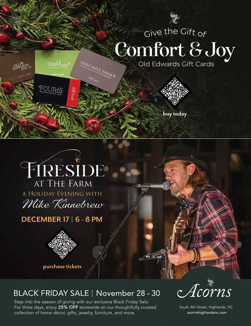 December in Highlands means many things, but for music lovers, it means Mike Kinnebrew is coming home to The Farm at Old Edwards. The singer-songwriter’s annual Fireside at The Farm concert returns Wednesday, December 17, this time with special guest Paul Moak, the Grammynominated producer and guitarist who’s played with Heart and appeared on The Tonight Show with Jimmy Fallon.