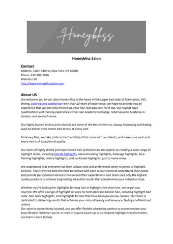 Phone: 212-288-1676 About US We welcome you to our salonHoney Bliss at the heart of the Upper East Side of Manhattan, NYC. Styling, coloring and cutting hair with over 20 years of experience, we hope to provide you an experience that will not only freshen up your hair, but also care for it too. Our stylists have qualifications and training experiences from Hair Academy Dessange, Vidal Sassoon Academy in London, and so much more. Our highly trained stylists and colorists are some of the best in the city, always improving and finding ways to deliver your dream hair to you at every visit. At Honey Bliss, we take pride in the friendships that come with our clients, and make sure each and every visit is of exceptional quality. Visit our highlights salon today and let us help you achieve the perfect look with our expert highlight services. Call us at (212) 288-1676. Related Searches balayage highlights|Hair salon| highlights salon| hair highlights|blonde highlights| balayage highlights|natural-looking highlights| face-framing highlights| highlights for hair| highlight hair color| hair color highlights| highlights for long hair| ombre highlights| sunkissed highlights| highlights near me| highlights for dark hair| highlights for blonde hair| NYC| NY. Additional Details Working Hours: Mon-Fri 10 AM–8 PM, Sat 10 AM–7 PM, Sun 10 am–6 pm Payment method: Cash, check, all cc GMB Listing https://www.google.com/maps?cid=3424575626295117404