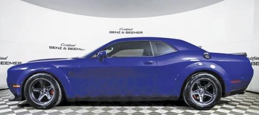 2020 Dodge Challenger SRT Super Stock- Indigo blue over black leather, 807 hp supercharged HEMI V8, 8-speed autoc trans, 7,112 miles, customer preferred pkg, plus pkg, power sunroof, harman/kardon premium sound, laguna leather pkg, technology pkg, driver convenience pkg, superstock suspension, heated & ventilated seats. $82,000 Stock #P23538 Certified Benz & Beemer (844) 568-1362