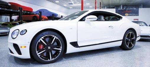 2022 Bentley Continental GT- Beluga over hotspur hide, 4.0 liter twin-turbo V8, 8-speed auto trans, 7,177 miles, chrome lower matrix grille, LED welcome lamps by Mulliner, comfort front seats, diamond-in-diamond interior stitching, Flying B embroidered to headrests. $189,988 Stock #8923UC O’Gara Coach Beverly Hills (310) 659-4050