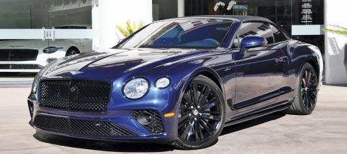2022 Bentley Continental GTC Speed Convertible- Peacock over imperial blue/ tan leather and alcantara, 650 hp twin-turbo 6.0 liter W12, auto trans, AWD, 4,464 miles, Naim audio, diamond knurling interior trim, touring specification, mood lighting specification, 22 inch speed wheels, styling specification, carbon ceramic brakes, air ionizer. $259,990 Stock #9112UC O’Gara Coach Beverly Hills (310) 659-4050
