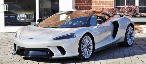 2023 McLaren GT- Supernova silver over carbon black leather, 612 hp 4.0 liter twin-turbo V8, 7-speed auto trans, 1,901 miles, interior carbon fiber pack 3, carbon fiber door sills, vehicle lift, font & rear parking sensors, premium pack, luxe P22 pack, luxe design, sports exhaust, premium 10-spoke alloy wheels, carbon brakes, red calipers. $174,988 Stock #8894UC O’Gara Coach Beverly Hills (310) 659-4050