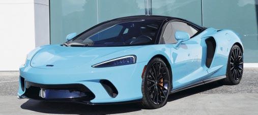 2023 McLaren GT Coupe- MSO Tokyo cyan over jet black leather, 612 hp twin-turbo 4.0 liter V8, 7-speed automatic trans, 7,791 miles, orange calipers, 15-spoke forged wheels, vehicle lift, parking assist w/ camera, premium pack, Bowers & Wilkins audio, panoramic glass roof, sport exhaust. $167,990 Stock #24L0054AA O’Gara Coach Beverly Hills (310) 659-4050