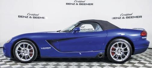 2006 Dodge Viper SRT10 Convertible- Viper GTS blue over blue/ black leather, 780+ hp 8.3 liter V10, 6-speed manual trans, 22,023 miles, black soft top, No Expense Spared on this custom build, suede and snake skin interior, over 780 hp with Paxton Supercharger and air intake, B&B headers, high flow catalytic converters, short throw shifter, etc. $57,500 Stock #22928 Certified Benz & Beemer (844) 568-1362