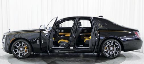 2022 Rolls-Royce Ghost Black Badge- Black over forge yellow/ black leather, 591 hp twin-turbo 6.75 liter V12, 8-speed auto trans, 9,975 miles, 21”carbon fiber & alloy wheels, lambswool floor mats, bespoke audio, rear theatre configuration, Black Badge technical fibre trim, illuminated grille, RR monograms to all headrests. $299,900 Stock #B24583 Marshall Goldman Beverly Hills (424) 430-1400