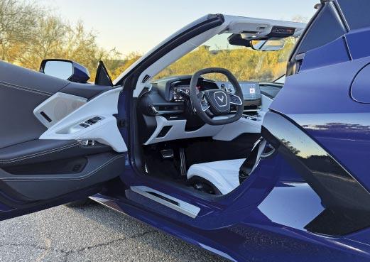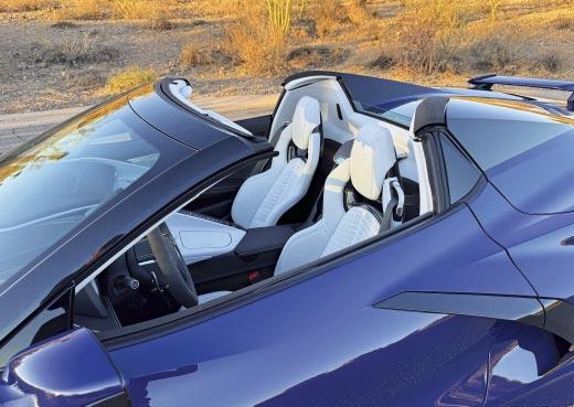 The carbon-fiber dash, console and sills create an atmosphere of high-tech minimalism, while touches like a touchscreen infotainment system, a windshield-mounted rearview camera screen and a touchpad climate-control knob provide modern comforts. A digital display sits ahead of the driver, offering configurable readouts that keep vital information front and center. The flat-top and flat-bottom steering yoke, trimmed in black leather, houses controls for drive modes, lighting and more, putting the car’s immense capability at your fingertips.