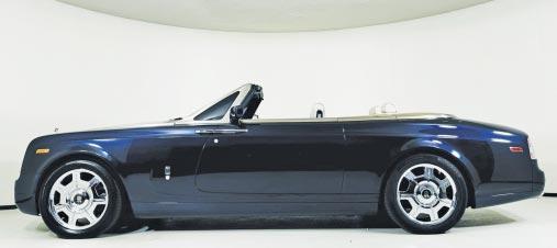 2009 Rolls-Royce Phantom Dropped Coupe- Metropolitan blue metallic over creme light/ navy blue leather, 6.75 liter V12, auto trans, 51,255 miles, brushed stainlesssteel hood, teak tonneau cover, RR embroidered to headrests, wood veneer steering wheel spokes, power heated seats w/ memory, power blue soft top, chrome premium wheels. $159,999 Stock #L6343A Luxury Auto Collection (480) 405-8265