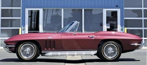 1966 Chevrolet Corvette Stingray Convertible- Milano maroon over black leather, 390 hp 427 ci V8, 4-speed manual trans, 70,600 miles, black convertible top, power steering, power disc brakes, wood rimmed steering wheel, Bridgestone gold line tires on alloy wheels w/ three ear knock-off hubs, side exhaust. Stock #127408 Copley West (949) 836-8844
