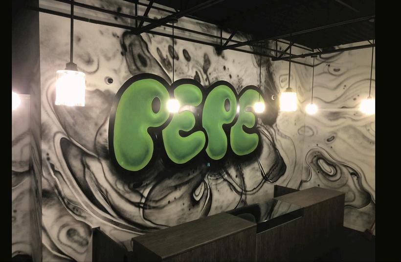 (UPHI) features a mountain landscape, geometric patterns, and flowers. (PEPE) is more abstract, which mimics the topographic style of the business' storefront and window decals. Similarities I featured the logo in both murals and used airbrush, spray paint and brush work to complete both. I try to make unique and different work for every job I do, that way each mural has its own personality and also gives me the opportunity to try something new.