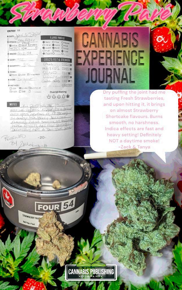 pp g g y , p icro's across Canada to cultivate strains. This strategy ensures a diverse nge of high-quality products while supporting local businesses and fostering sense of community within the industry. Collaboration with these micro oducers allows FOUR54 to offer exclusive, expertly crafted strains not pically found in larger operations. This dedication to quality and community ets them apart and resonates with customers who value premium cannabis nd its origins One notable strain is Strawberry Pavé, grown by Golden Peak annabis in Moncton, New Brunswick! Strawberry Pavé, a unique indica ybrid, combining spicy and sweet berry flavors This strain, a cross between d pop and Pavé, offers a delightful blend of spiciness and fruity notes Its ense buds are coated in a rich layer of trichomes, making it both visually appealing and potent Users often report a calming, body-centric high that is perfect for relaxing evenings or winding down after a long day