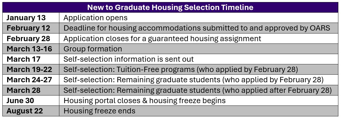 On-going self-selection will continue until the housing portal closes on June 30, 2025. If a student has not made a selection and wishes to live in graduate housing, they must contact the Office of Student Life to be placed in a housing assignment based on availability.