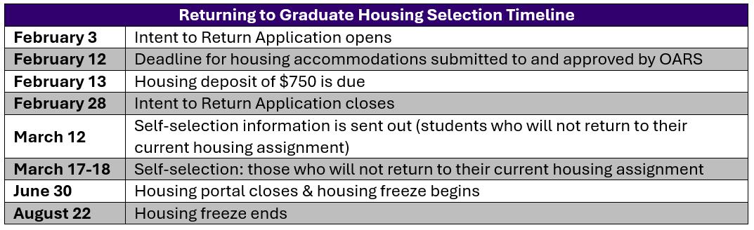 Once the above requirements have been met, students may either move to graduate housing or may remain in their undergraduate assignment until they have a graduation date for their undergraduate degree