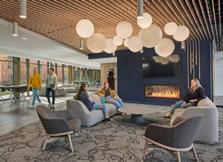 of two doubles and two singles, 22 three-bedroom units with three doubles, five two-bedroom units with one double and one single bed, and eight single units. Additionally, there will be 10 ADA single rooms and one Super ADA room for those needing this type of accommodation. Each of the building’s six floors will have two lounges, one for socializing and another for studying. The building was designed with a great room with a kitchen, staff offices, and residential storage locker rooms