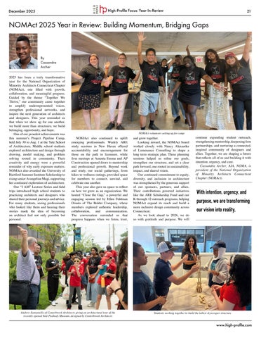 National Organization of Minority Architects Connecticut Chapter (NOMAct) shares how the organization prioritized expanding youth outreach through programs in 2025, like Project Pipeline Camp at the Yale School of Architecture and the “I AM” Lecture Series, while also supporting emerging professionals with weekly Architect Registration Examination (ARE) study sessions. Read more on page 21.