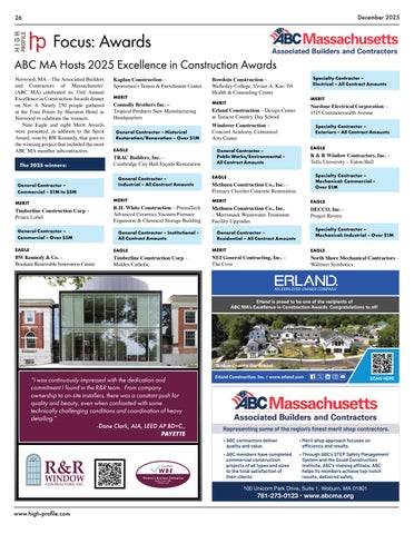Education Center. Read about these exciting projects on page 22. Awards season is upon us once again! Congrats to all the winners of the New England chapters of the Associated Builders and Contractors’ (ABC) Excellence in Construction Awards. Our cover image is of the Barnum Museum building envelope restoration, which was awarded Best in Show by CT ABC (submitted by Kronenberger & Sons Restoration, LLC), as well as being recognized by AIA Connecticut (submitted by Antinozzi Associates). See all the award winners, beginning on page 26.