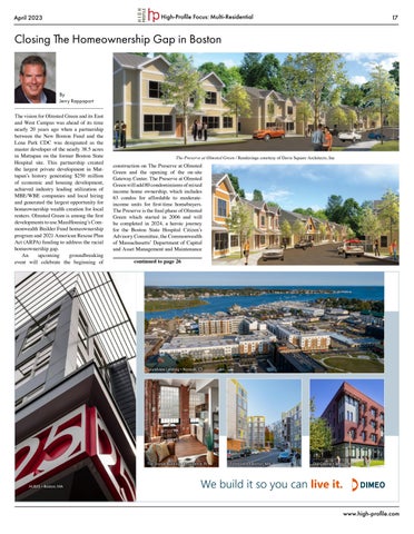 a 500-unit mixed income development on the former Boston State Hospital site. The project is entering its last phase and is an example of a project that will not only improve the community, but will help close the gap on homeownership in Boston. Read the story, written by Jerry Rappaport of CRP Development, on page 17.