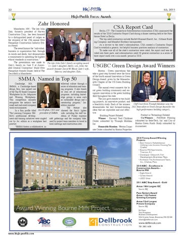 Boston - Green innovations that take a giant step forward were the focus of the fourth annual Innovation in Green Design Award, given by the Massachusetts Chapter of the US Green Building Council. The annual event connects the local green building community and recognizes innovation in the green building field throughout the state. The jury gave awards to two building projects, an innovative product, and a feasibility study. Each of the winners Cliff Court from Triumph Modular wins the demonstrates the best forward-looking 2011 Innovation in Green Design Award for the high-performance building category. ideas that are replicable and cost effective. Product or Technology Related Building Project Related Co-Winners - FreeStyle Flooring Winner - Harvard Yard Childcare Center submitted by Triumph Modular, submitted by SelecTech, Inc. and City of Boston Green Roofs Study submitted by Inc. Honorable Mention - Weston Corpo- Arrowstreet. rate Center submitted by Boston Properties 2010 Timmy Award Winning Projects • Best Historic Rehabilitation Utilizing Low-Income Housing Tax Credits • Bourne Mill Apartments, Tiverton, R.I. • Developer: Edward A. Fish Development, Braintree, Mass. • Architect: The Architectural Team, Inc., Chelsea, Mass. 2010 ABC - Excellence in Construction Awards – Bourne Mill • Eagle Award • Green Award • LEED Silver 2011 ABC Step Award - Gold Areas 18th Largest GC Source BBJ Pace Setters Award Areas 11th Fastest Growing Company