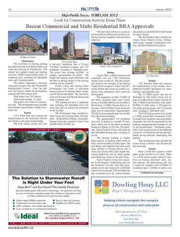 1282 Boylston Boston 1282 Boylston Street will continue the transformation of the corridor into a pedestrian-friendly destination for retail, business, and residential uses. The 331,000sf project that will be developed by The Abbey Group will replace an underutilized surface parking lot with 12,000sf of ground-floor retail space, 88,000sf of office space, a 295-space below grade parking garage, and 210 housing units, including 21 affordable units. The $150 million project will include a 2,700sf ground floor community center furnished with computers and presentation equipment that will be maintained by the building management and available for use by the neighborhood. Substantial investment in the reconstruction of the sidewalks in front of 1282 Boylston will include highquality paving materials, landscaping, and lighting. The development team includes the Abbey Group, architects, and Bruner/Cott and Associates. Boston Phase 1 of the Pier 4 project, a three phase project located on 9.5 acres. Phase 1 is a $150 million project that will transform an existing restaurant, patio, surface parking, and deteriorating pier into a mixed-use complex with 625,000sf of residential space, 20,000sf of public civic Continued on next page