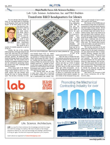 ing developed For over a decade, Idenix Pharmaceua strong workticals, Inc. has leased space in Cambridge ing relationship at 60 Hampshire Street and One Kendall with BMR in Square. As the lease neared its term, the the past, Idedrug discovery comnix decided to pany had to make big have BMR dedecisions about its liver the space real estate options. on a turnkey Sam Wilde, Idenix’s arrangement. Facilities Director, BMR assemhired Lab / Life. Scibled a team ence. Architecture, that included Inc. (LAB) to assist The Richmond in determining their Group /TRG space requirements Mark Reed Builders and and to explore how AHA Engineers, they would fit into a and was led by number of available properties in and out Mark Reed and of the city. Stephanie GoldInitially, the lure of the suburban R&D properties, with bigger footprints and Aerial view of the 40,000sf plan Photo bt Lab / Life. Science. Architecture, Inc. berg, principals at LAB, as delower rents, held sway over the company. with BioMed Realty Trust, Inc. (BMR) Upon closer examination of the company’s whose portfolio of space included an exist- signers and architect of record. Task One was to evaluate the existpriorities, however, the leadership deter- ing lab/office at 320 Bent Street that very mined that Kendall Square best suited their closely approximated the office / chemis- ing conditions and determine the areas that strategic needs. This was primarily due to try / biology ratio that Idenix needed. Ac- had the best potential for laboratory re-use. the access to academic research in the area cording to Wilde, this solution best met the Task Two was to clarify the circulation and the collaborative partnerships Idenix strategic objectives to “upgrade our facil- patterns and clear up a clutter of opaque has enjoyed with other Cambridge-based ity and create a space that better suited our support labs. Task 3 was to re-conceive biotech companies. processes for R&D Research with an open the rabbit warren of office space as a light Never losing sight of the financial environment more suited to open collabo- filled, open office environment. All together, this approach yielded a project plan aspects of the decision to remain in Cam- ration among our personnel.” bridge, Idenix started to focus on a real The existing space was not ideal that met the functional and aesthetic needs estate solution that had retained value in many ways, either from a functional of Idenix at a construction cost that was through the reuse of existing laboratory or an aesthetic standpoint, so it was clear substantially below industry standard. As space. This led them, eventually, to a deal that a transformation was needed. Hav- Dave Mello of the Richmond Group said,