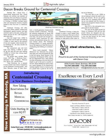 the city of Peabody. “Our units start at just 1,500sf so we are looking to attract the small to medium size business. We are just getting started with our marketing efforts, and we are very pleased with the strong response from prospective tenants we have receivedPlainville, so far. ” 60 ManMar Drive, MA 02762 May 2014 is the anticipated occuRendering Centennial Crossing pancy date for the first tenants. This will be the eighth project for Peabody. tures, a fourth-generation family-owned Dacon in Centennial Park and the fifth “Centennial Crossing is being debusiness located in Braintree. “Through project Dacon has designed and conveloped to create a much needed retail the unfailing cooperation of Dacon and structed with John and Kevin Lucey. This presence in Centennial Park and to attract the conscientious effort of the Steel Strucis also the third project for the Lucey new medical and commercial businesses tures team, this project was brought to a Family in Centennial Park. looking for high-quality office space to successful, timely conclusion for steel NE Ny Tel: 781-878-4540 erection and placement during this very REAL EStAtE JOuRNAL busy holiday season. The Centennial New Proof Proof Approved Changes Crossing project is a strong representation of the expertise of Steel Structures in Size: 2x4 PoM Section: NE roP coordinating and fulfilling its customers’ from: PSC needs.” Kevin Lucey remarked, “Mayor run Date: 11/15/13 Bettencourt has welcomed this project with open arms since we pitched the idea to him last spring. Karen Sawyer of the Community Development Office, and all Proud to be part of the Centennial Crossing project the city departments have been nothing with Dacon Corp. less than outstanding in the way they have helped us get to this point as quickly as we have. Mayor Bettencourt and his team 400A Franklin Street, Braintree, MA 02184 are a great example of city departments Tel (781) 848-4599 / Fax (781) 843-4384 working together toward a common goal www.steelstructures-ma.com / mike@steelstructures-ma.com of a project that is good for the city of