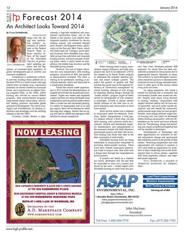 cess than from developer-initiated 40B proposals, for which there has been considerable pushback by communities due to inappropriate density, character, or siting. The incentive to build affordable communities should be a priority as Massachusetts continues to lose its young, educated workforce to other parts of the country where living costs are lower. An aging population will create a market for housing that is accessible and conveniently located near mixed-use centers. Smaller scale senior living facilities in existing “walking” communities with support facilities nearby will be more easily permitted, will have faster market absorption, and will benefit the community, unlike remote large-scale life care projects. Smaller, more energy-efficient single family housing will also likely be developed within existing communities, with less dependency on car travel and more efficient land use. The planning, design and permitting will require architectural expertise that will be valuable to developers. Developments in technology will offer opportunities for architects as offsite information storage and government data collection results in the growth of data centers. Permitting complexities and code requirements will continue to increase in 2014 and create an opportunity for architects to take a leadership role on the development team to advise owners, negotiate with town regulatory officials, and expedite project approval. Vcevy Strekalovsky is president of Strekalovsky Architecture Inc. HIngham, Mass.