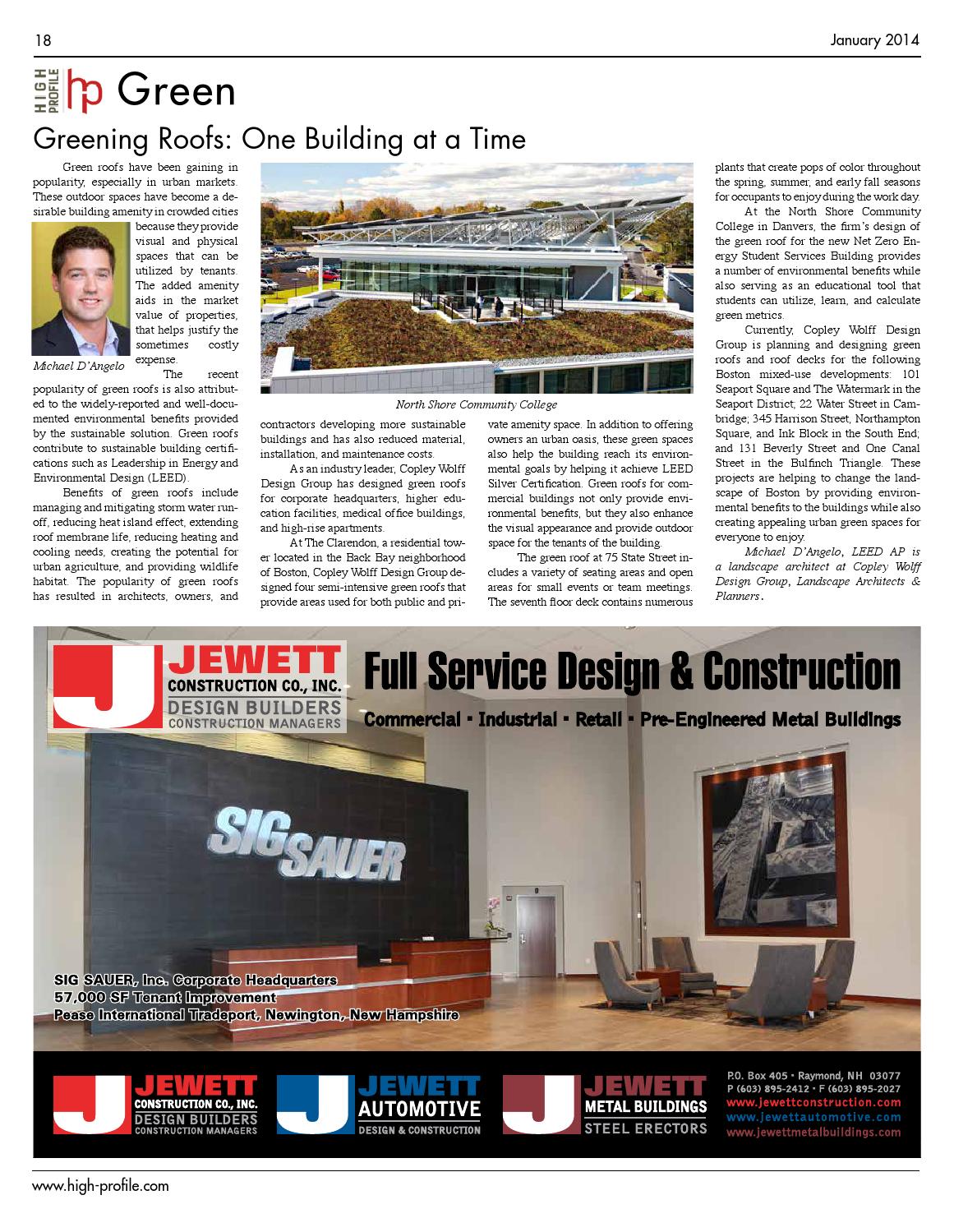 plants that create pops of color throughout the spring, summer, and early fall seasons for occupants to enjoy during the work day. At the North Shore Community College in Danvers, the firm’s design of the green roof for the new Net Zero Energy Student Services Building provides a number of environmental benefits while also serving as an educational tool that students can utilize, learn, and calculate green metrics. Currently, Copley Wolff Design Group is planning and designing green roofs and roof decks for the following Boston mixed-use developments: 101 Seaport Square and The Watermark in the Seaport District; 22 Water Street in Cambridge; 345 Harrison Street, Northampton Square, and Ink Block in the South End; and 131 Beverly Street and One Canal Street in the Bulfinch Triangle. These projects are helping to change the landscape of Boston by providing environmental benefits to the buildings while also creating appealing urban green spaces for everyone to enjoy. Michael D’Angelo, LEED AP is a landscape architect at Copley Wolff Design Group, Landscape Architects & Planners.