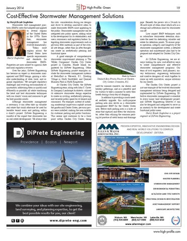 Cost-Effective Stormwater Management Solutions by Sheryl Bezak Guglielmo Stormwater best management practices (BMPs) were first adopted and applied to several regions of the United States in the 1970s. Since then, stormwater management has evolved dramatically. Today, most regions across the United States have specific requirements Sheryl Guglielmo and standards for stormwater BMPs. Properties are now subject to rigorous state and local regulatory reviews. Over the years, DiPrete Engineering has become an expert in stormwater management and BMP design, gaining a valuable understanding of state, local, and regional regulations. We navigate regulatory challenges and evolving environmental requirements, addressing them as quickly and efficiently as possible, all while combining the latest and best stormwater techniques with our clients’ vision and resources to get the best possible results. Although stormwater management is necessary, it can often take up valuable real estate that could otherwise be used for leasable tenant areas and parking within a client’s project. DiPrete Engineering is mindful of the impact that stormwater has on real estate development. We always take