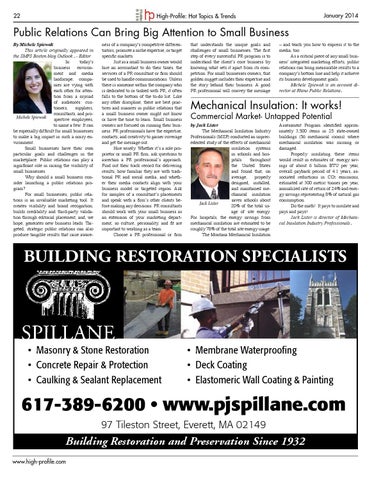 Public Relations Can Bring Big Attention to Small Business By Michele Spiewak This article originally appeared in the SMPS Boston blog Outlook . - Editor In today’s business environment and media landscape, companies are vying with each other for attention from a myriad of audiences: customers, suppliers, consultants, and proMichele Spiewak spective employees, to name a few. It can be especially difficult for small businesses to make a big impact in such a noisy environment. Small businesses have their own particular goals and challenges in the marketplace. Public relations can play a significant role in raising the visibility of small businesses. Why should a small business consider launching a public relations program? For small businesses, public relations is an invaluable marketing tool. It creates visibility and brand recognition, builds credibility and third-party validation through editorial placement, and, we hope, generates new business leads. Targeted, strategic public relations can also produce tangible results that raise aware-