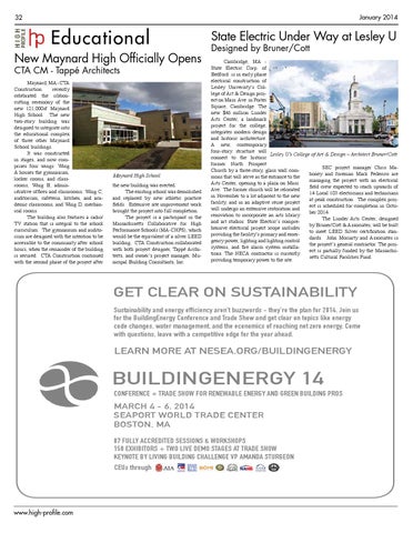 Educational New Maynard High Officially Opens CTA CM - Tappé Architects Maynard, MA - CTA Construction recently celebrated the ribboncutting ceremony of the new 121,000sf Maynard High School. The new two-story building was designed to integrate into the educational complex of three other Maynard School buildings. It was constructed in stages, and now comprises four wings: Wing A houses the gymnasium, locker rooms, and classrooms; Wing B, administrative offices and classrooms; Wing C, auditorium, cafeteria, kitchen, and academic classrooms, and Wing D, mechanical rooms. The building also features a radio/ TV station that is integral to the school curriculum. The gymnasium and auditorium are designed with the intention to be accessible to the community after school hours, when the remainder of the building is secured. CTA Construction continued with the second phase of the project after