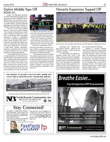 l-r: Ed Bond, CEO of BOND; Chris Callanan, Steve Mai, and Joseph Bertrand-of the Galvin Middle School Permanent Building Committee; Katie Philbin, Ryan Dirico, Dave Capaldo, James Wrisley and Frank Hayes, all of BOND; Patrick Glynn, chair of the Galvin Middle School Building Advisory Committee; and Linda Carlson and Gregg Hogg of BOND that will house academic classrooms, a library, cafeteria, and administrative space. The team also completed a turf field prior to the start of building construction. Future phases of work will include the abatement and demolition of the existing Galvin Middle School to make way for the new facility’s gymnasium, as well as the fit-out of the remaining incomplete interior spaces. BOND will also build a second turf field for the campus. Final project completion is scheduled for summer 2015.