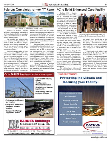 elevators, and a circulation core punctuated by a prominent entrance canopy. No component of the building was left untouched; from basement to roof, the entire envelope was redeveloped for energy efficiency, and the exterior received aesthetic treatments to resemble the main hospital palette of finishes. Additional square footage was accomplished by infilling floor decks at the mid-level of the two gymnasiums and the swimming pool, as well as decking over the swimming pool itself. The building also received completely new state-of-theart energy-efficient electrical and mechanical systems and controls, adding to patient comfort for years to come. Other features of the building include an emergency generator and a common area dining café. Fulcrum Associates of Amherst partnered with Dennis Mires The Architects P.A. of Manchester for the project;, site engineering was prepared by Hayner & Swanson of Nashua.