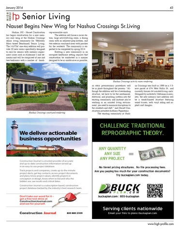 Senior Living Nauset Begins New Wing for Nashua Crossings Sr.Living Nashua, NH - Nauset Construction has begun construction for a new memory care wing at the Nashua Crossings senior living community for Wellesley, Mass.-based Benchmark Senior Living. The 14,675sf one-story addition will provide 20 new rooms specifically designed to care for seniors with memory impairment issues such as Alzheimer’s and dementia and will be comprised of one and two-bedrooms with a number of handi-